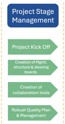 When the project officially starts we coordinate the kick off of the project, instigate the internal project governance structures, boards and functional committees to manage the project, we provide guidance and training on administrative aspects, Project Reporting, Risk Management and Quality control. we also provide all necessary templating and supporting tools alongside the collaborative working environment and document repositories.