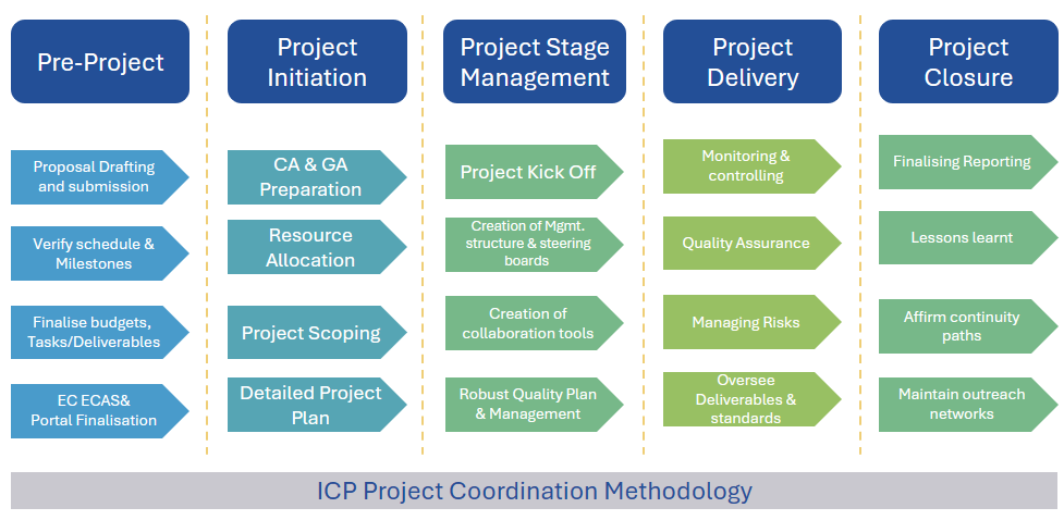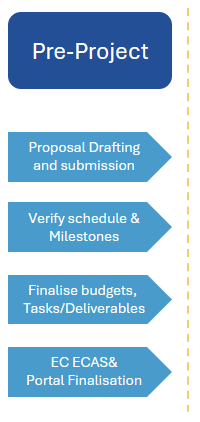 In this phase we lead the consortium partners through the Grant Preparation Phase, liaising with the European Commission addressing the needs of all stakeholders to baseline the project. We ensure that the resources to deliver are in place and that we have clarified and have an agreed understanding of the scope of work with those partners that will be responsible for delivery, avoiding confusion and differing views which can cause issues once the project is in progress.